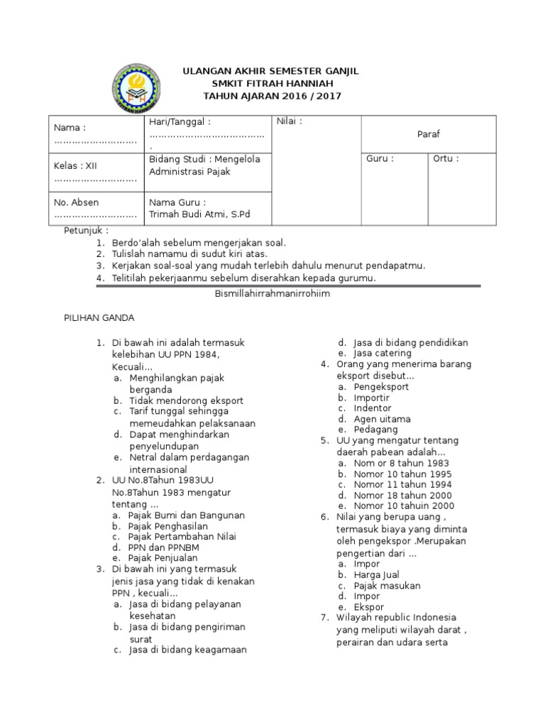 10.000.000 pernyataan berikut ini yang benar adalah. Soal uas administrasi pajak semester ganjil 11. Usaha yang dipergunakan oleh orang pribadi yang tidak bertempat tinggal di indonesia tidak lebih dari 183 hari dalam jangka waktu 12 bulan, dan badan yang tidak didirikan dan tidak berkedudukan di indonesia disebut. Di bagian akhir setiap bab, tingkat pemahaman konsep peserta didik diuji melalui beragam bentuk soal evaluasi. Rpp administrasi pajak kelas xii rpp administrasi umum rpp akuntansi dasar rpp etika profesi rpp komputer akuntansi kelas xi rpp komputer akuntansi kelas xii rpp pratikum akuntansi lembaga/instansi pemerintah sejarah indonesia silabus akuntansi keuangan lembaga simulasi digital soal administrasi pajak kelas xi smk soal administrasi umum smk. Pada postingan kali ini admin akan memberikan contoh soal ulangan semester ganjil mata pelajaran administrasi pajak, serta kunci jawabannya. Soal ulangan terdiri dari 45 pertanyaan pilihan ganda yang harus dijawab seluruhnya dalam waktu 90 menit. Pembelian barang dagang dan barang lainnya secara kredit dicatat pada. Buku administrasi pajak (paket keahlian akuntansi) untuk smk/mak kelas xii ini disusun berdasarkan kurikulum 2013. Administrasi pajak kelas xii smk draft. Download kunci jawaban soal pilihan ganda bab perpajakan buka juga. Pkp a mempunyai pajak keluaran rp 12.000.000 dan pajak masukan rp. Soal pkn kelas 11 sem 2.